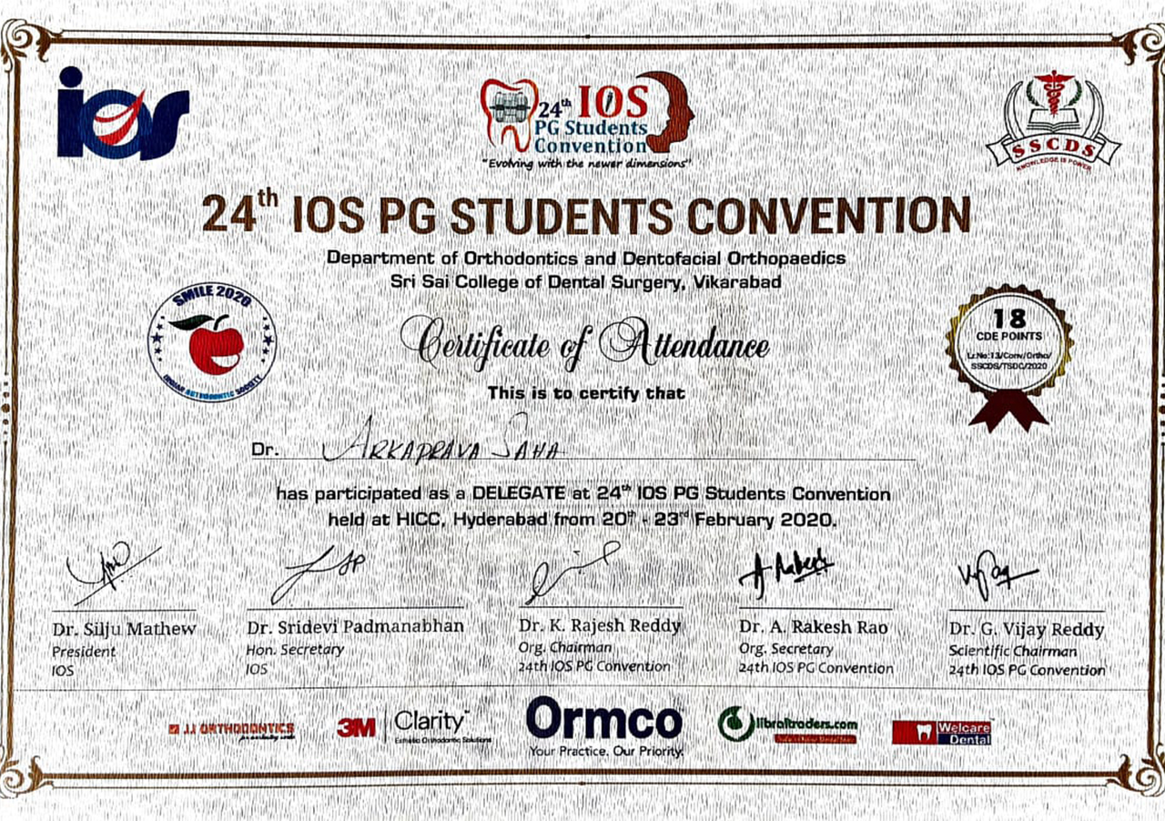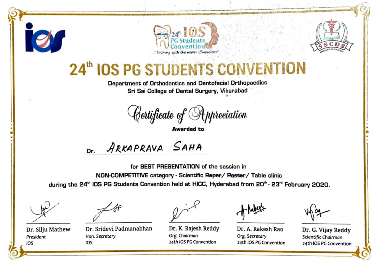 Presented Table Clinic at the 24th I.O.S Pg Convention on topic “Extraoral and intraoral Photography Light” Hyderbad.