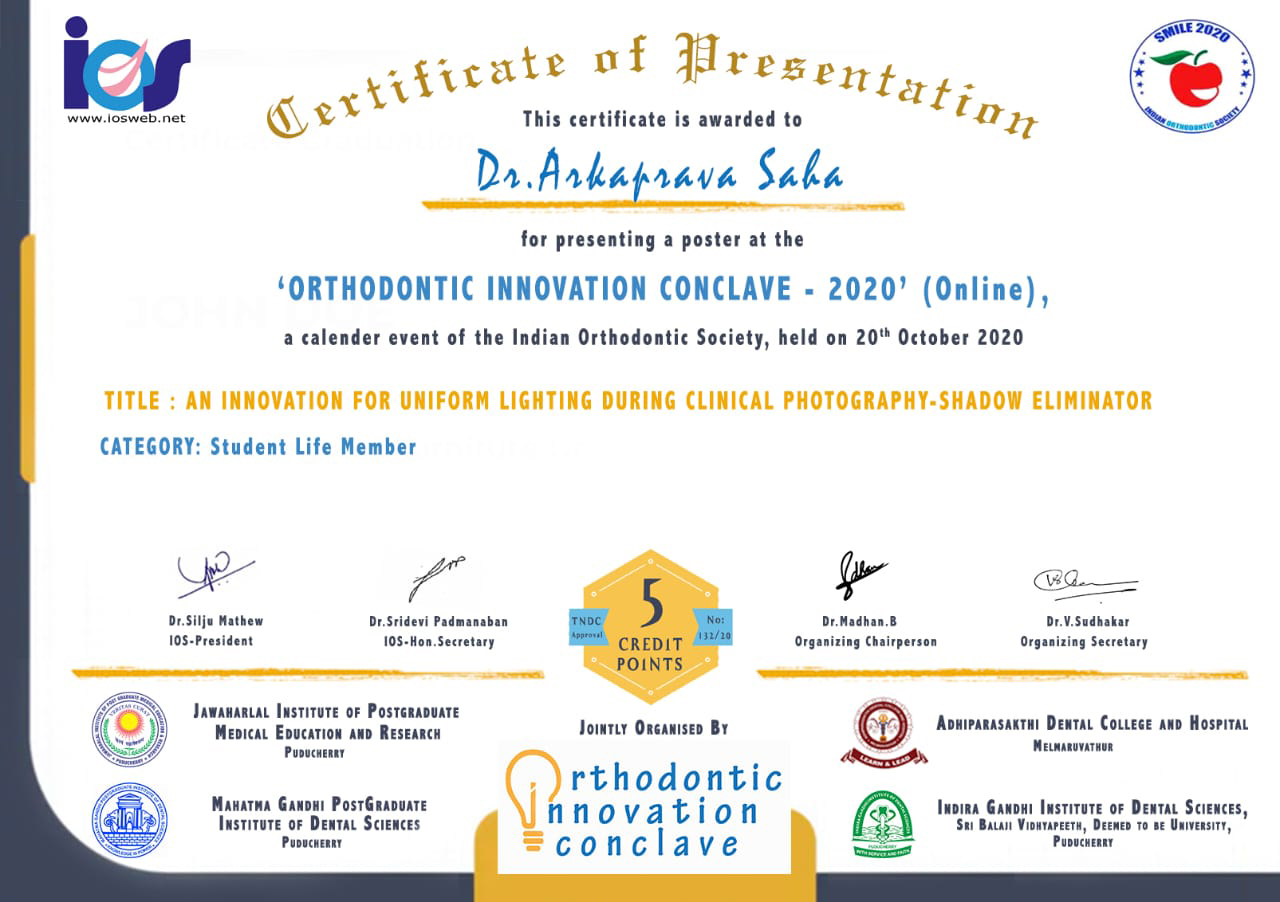 Orthodontic Innovation Conclave2020(online) – An Innovation For Uniform Lighting During Clinical Photography –Shadow Eliminator( my innovation)